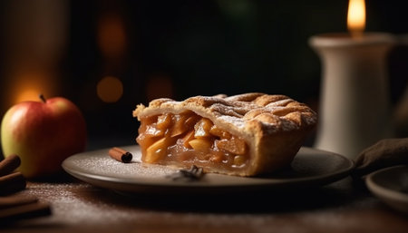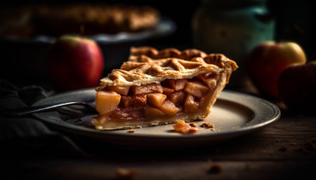 Indulgent homemade apple pie on rustic plate, ready to eat dessert generated by artificial intelligence