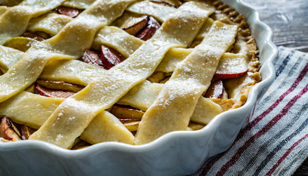 Traditional apple pie with lattice crust, known for its sweet and tart filling encased in a flaky crust.