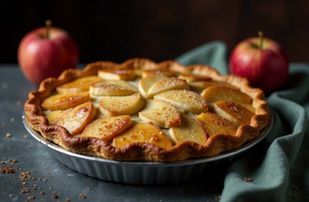 Homemade apple pie with caramelized apples on a rustic background