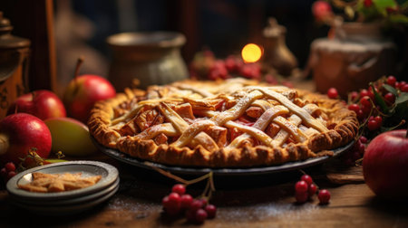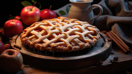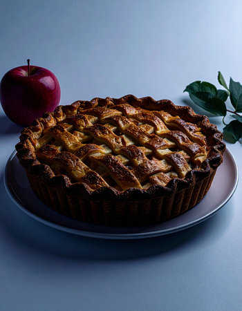 A whole, freshly baked apple pie with a classic golden-brown lattice crust. This traditional homemade dessert is perfect for Thanksgiving and autumn celebrations. High quality photo