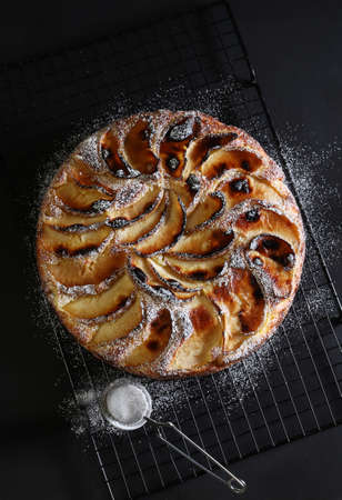 Homemade baking. Oven baked apple pie sprinkled with powder sugar on black wooden background. Top view. Summer dessert concept.