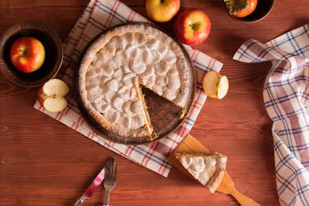 Delicious and warm homemade apple pie on a wooden table. Around him are apples, and cutlery. Pie on pottery. Photographed from above.