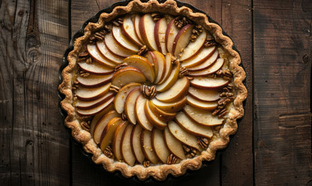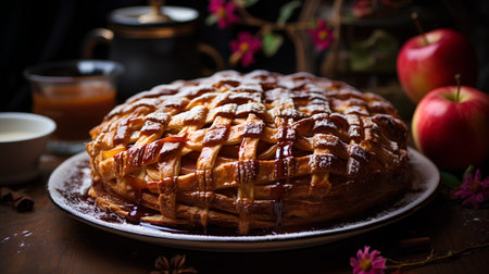 Freshly baked apple pie on rustic wooden plate, a sweet indulgence generated by artificial intelligence