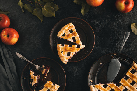 Piece of homemade apple pie Charlotte of red and yellow apples. Still life on the theme of autumn, harvesting apples and homemade cakes on a dark wooden table. Top view