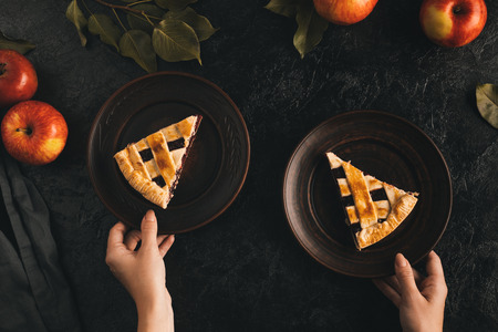 flat lay with female hands holding plates with apple pie pieces isolated on black tabletop