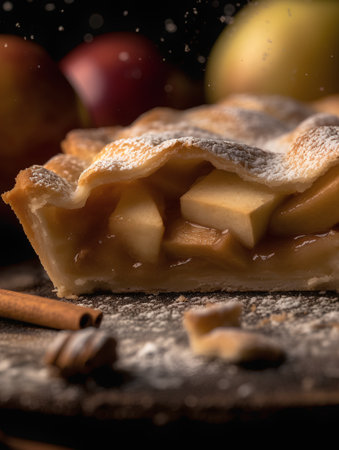 A tantalizing image fit for culinary publications, recipe blogs, or as material for cooking classes and cookware promotions | This picture depicts a freshly baked apple pie with great attention to textural detail and culinary craftsmanship. The golden crust is expertly latticed, allowing glimpses of the juicy, cinnamon-spiced apple filling within. A dusting of powdered sugar adds a festive, decorative touch while suggesting the sweetness of the dessert. The focus on the pie is so sharp that one can almost smell the warm, inviting aroma that is synonymous with home cooking and comfort food. The background, with softly blurred apples and kitchenware, supports the homely, rustic theme of the image. The use of natural light accentuates the flaky texture of the pie crust and the rich color variations of the baked apples | Perfect for enhancing the visual appeal of dessert menus, the image is also suitable for food photography tutorials emphasizing depth of field and composition. It can serve as an endearing visual for holiday-themed content, cookbooks, or as a mouthwatering centerpiece for articles discussing the art of pastry making. Moreover, it can adorn the walls of bakeries and cafes to entice customers | a high-resolution photo capturing the essence of homemade baking, focused on an apple pie with a dusty sugary finish on a woven lattice crust, placed on a wooden board and bathed in soft, diffused lighting to bring out the warmth and textures, leaving space for additional graphics or text