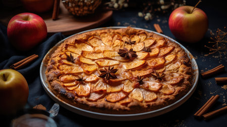 A freshly baked apple pie with a golden, flaky crust sits on a wooden table, surrounded by cinnamon sticks, star anise, and apples. The pie is adorned with a decorative arrangement of cinnamon sticks on top, and a warm, inviting light illuminates the scene.