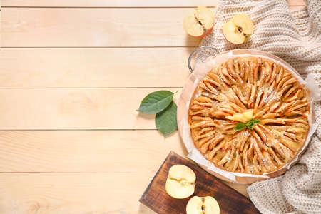 Apple pie with caramelized apples on a wooden table. Apple tart.