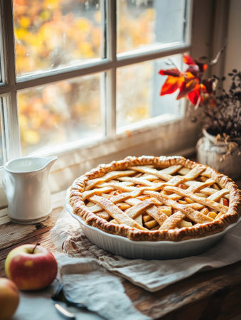 A close-up of a freshly baked apple pie resting on a rustic wooden table. The scene is enhanced by autumn foliage visible through a nearby window, creating a cozy atmosphere perfect for fall.