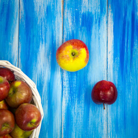 yellow and red apples (Malus domestica) fruit vegetarian food in a bowl over blue background