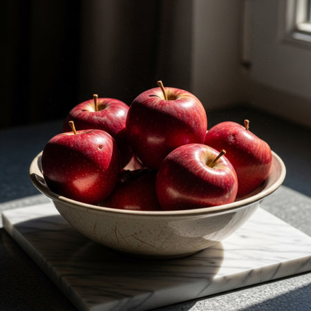 Dynamic, cinematic Dutch angle still life of crimson apples in a bowl on a marble slab, lit by harsh