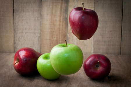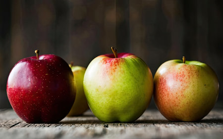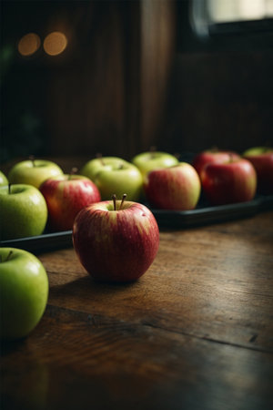 A visually appealing arrangement of fresh red and green apples on a rustic wooden surface, highlighted by natural lighting that enhances their vibrant colors and freshness.