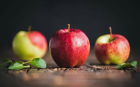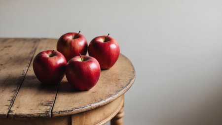 An AI generated illustration of ripe red apples placed on an aged wooden bench