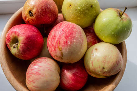 kitchen table with green and red apple - healthy eating and dieting food, concept of health care lifestyle.