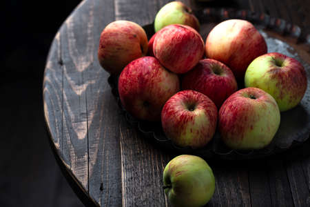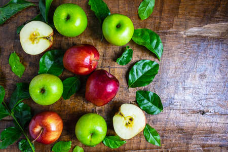 Isolated raw apples for dessert, fresh, nutritious and with vitamins on wooden table