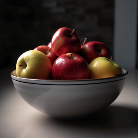 An AI generated illustration of a bowl of ripe, freshly picked apples atop a rustic wooden table