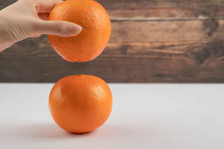 Female hand taking an orange from white table