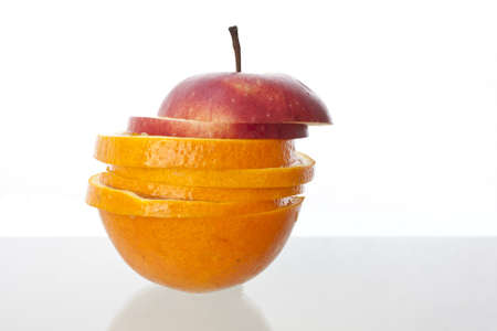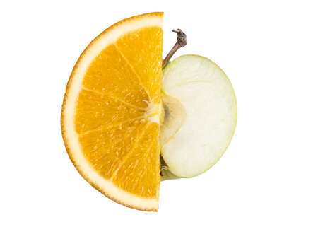 Ripe, fresh cut slices of orange and Apple isolated on white background. Perfectly retouched with clear details. Full depth of field. Fruit photographed in Studio on white background
