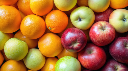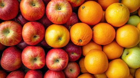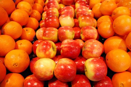 Fresh tangerine and apple stacked in rows