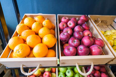 Healthy fruit and vegetables in grocery shop. Close up of baskets with apples and oranges in supermarket.