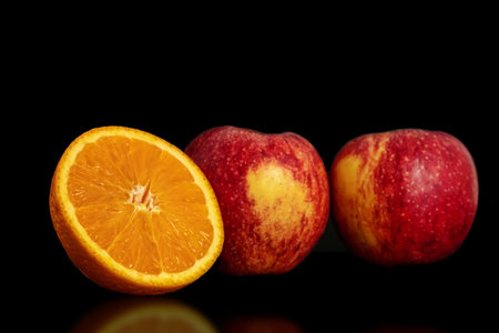 Orange and apple on a black background.