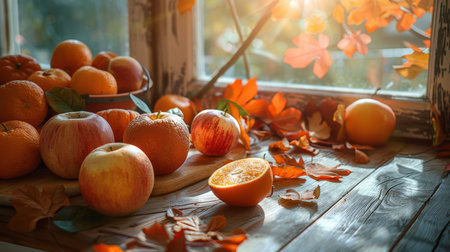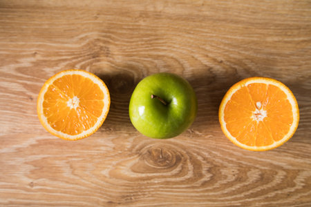 Bright, tasty, fresh, juicy orange slices with an apple slice on wooden background, natural vegan food, good for alphabet, vitamins for immune system