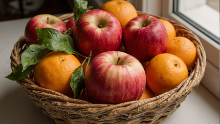 Fresh fruit is in a plate on the windowsill. Apples bananas and oranges.Soft focus. Backgrounds