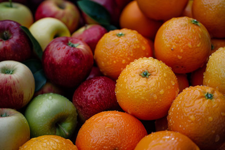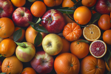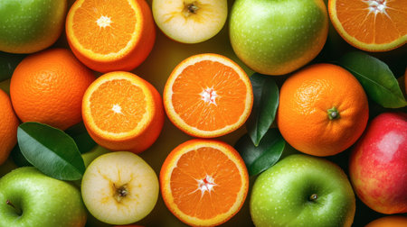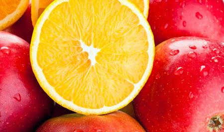 Healthy eating: closeup of fresh fruits, apples and cut oranges