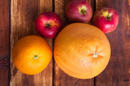 fruits on wooden background orange red apples grapefruit