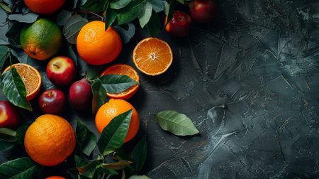 Oranges and apples on a grey concrete background with copyspace