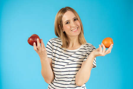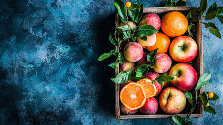 Oranges and apples on blue background