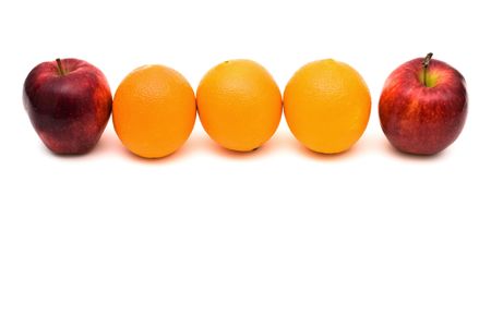 Red apples and oranges on white background