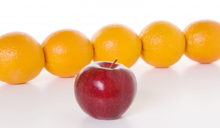 Oranges arranged to illustrate the concept of people lining up end to end while the apple stands alone like an independent, confident leader