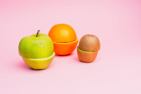 The concept of healthy eating. Half-cut fruits: a green apple, orange and kiwi on a pastel pink background.