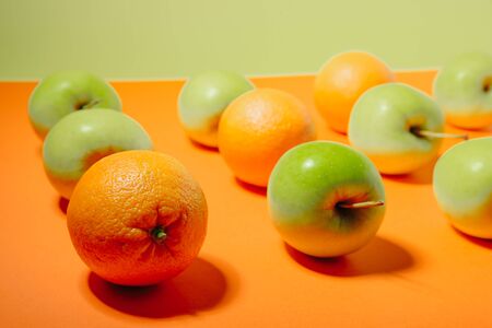 A bright, juicy orange accentuates boldness amid sleek, reflective green apples, illustrating the power of individuality against uniformity on a neutral gray backdro