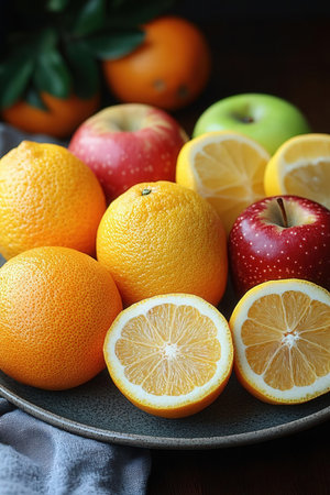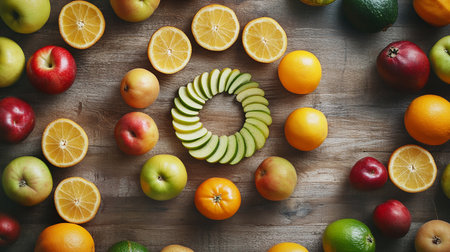 Colorful fruits including oranges, apples, and a lemon are neatly arranged on a textured wooden surface.