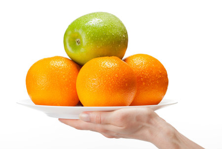Human hands holding plate full of fresh appetizing fruits (oranges and apple); isolated over white background