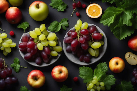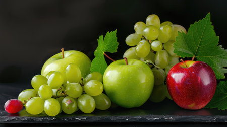 A stunning arrangement of fresh green apples and juicy grapes alongside a vibrant red apple, enhanced by green leaves on a dark slate surface.
