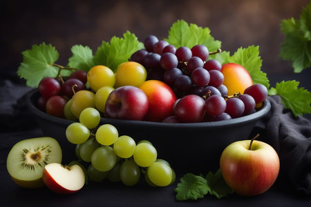A visually appealing arrangement of fresh, juicy apples mixed with plump, luscious grapes in a decorative bowl. The scene highlights rich colors and textures.