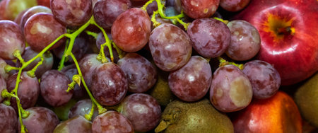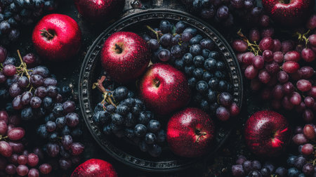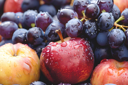 Ripe red apples and blue grapes covered in water drops create a vibrant display of freshness