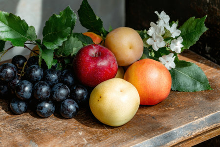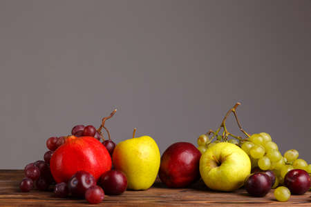 Freshly picked fruits and grapes on wooden table
