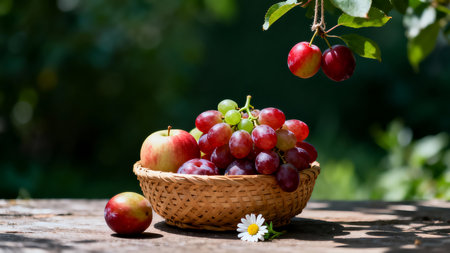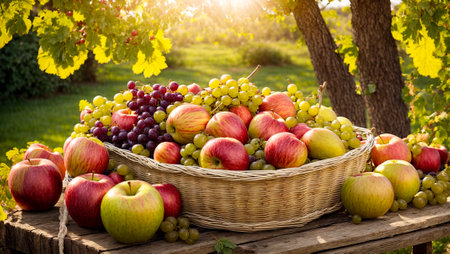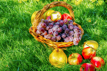 Assortment of fruits, apples, pears, grapes, in a basket in the garden