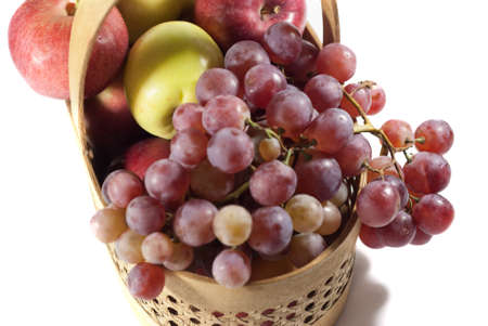 basket with white and red apples and grapes. Isolated