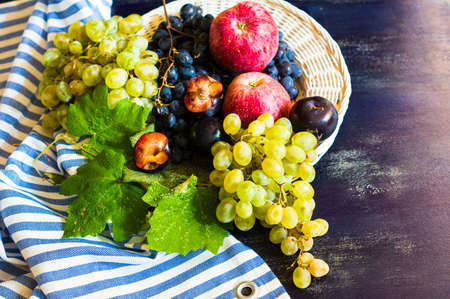 Grapes, apples and grapes on a wooden table. Dark background.