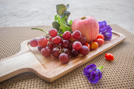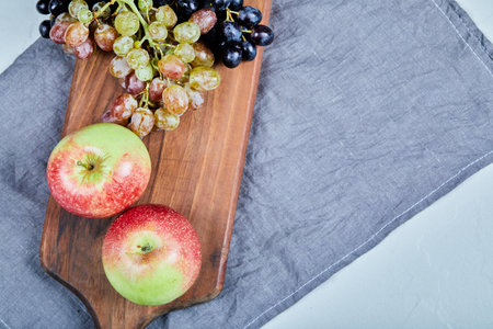 Red apples and grape bunches on a wooden board