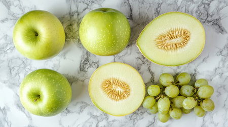 A beautiful flat lay of fresh green fruits including apples, grapes, and melon on a marble background, perfect for food photography and healthy lifestyle inspiration.
