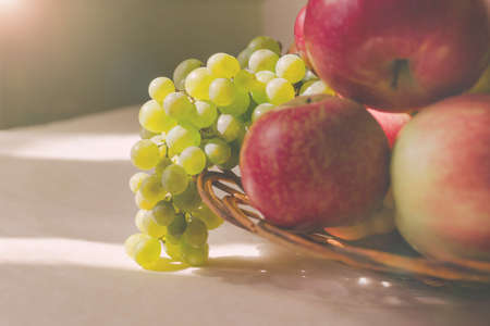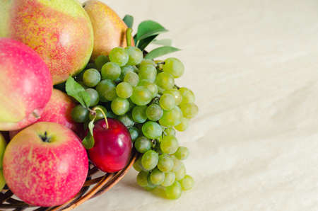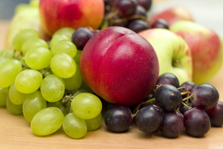Fresh fruits, apples, grapes and peaches on the table