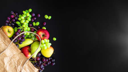 top view of fresh organic local fruits in brown paper bag on dark background