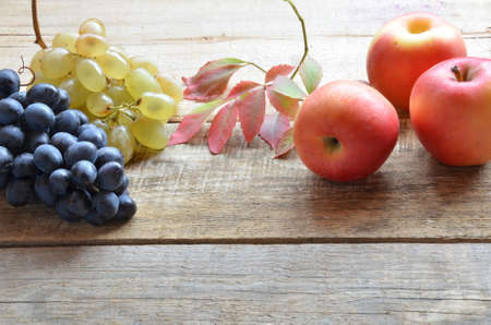 Still life with grapes and apples on a wooden table. Selective focus.