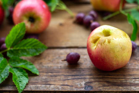 Still life of ripe fresh apples on an old wooden table